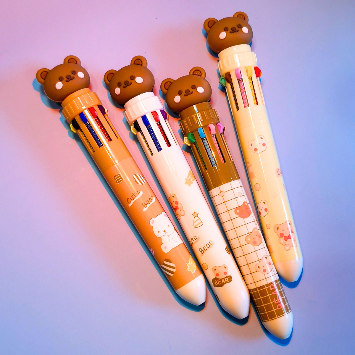 Claro! Aqui está a descrição no mesmo estilo, agora para a caneta multicolorida de ursinho: